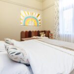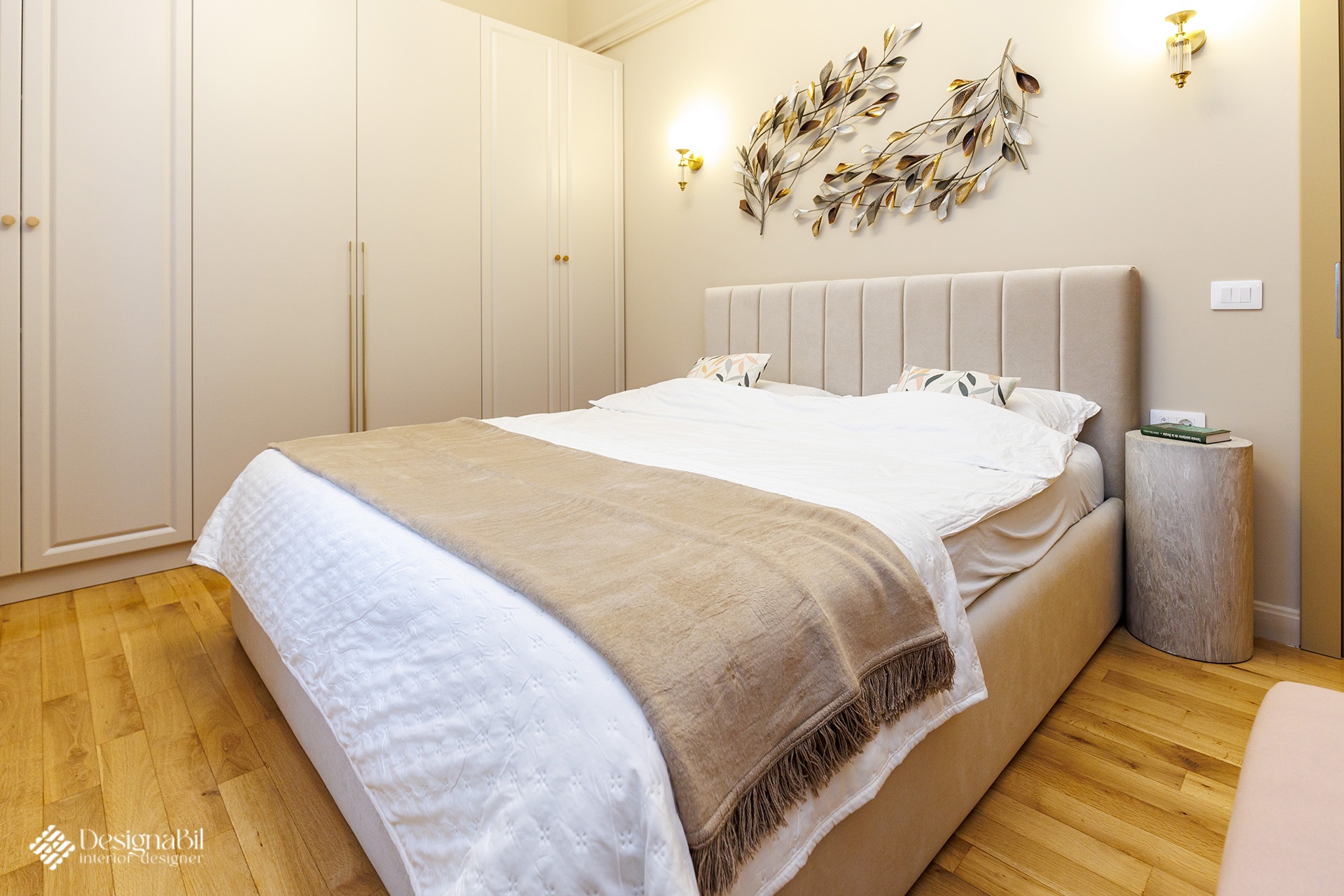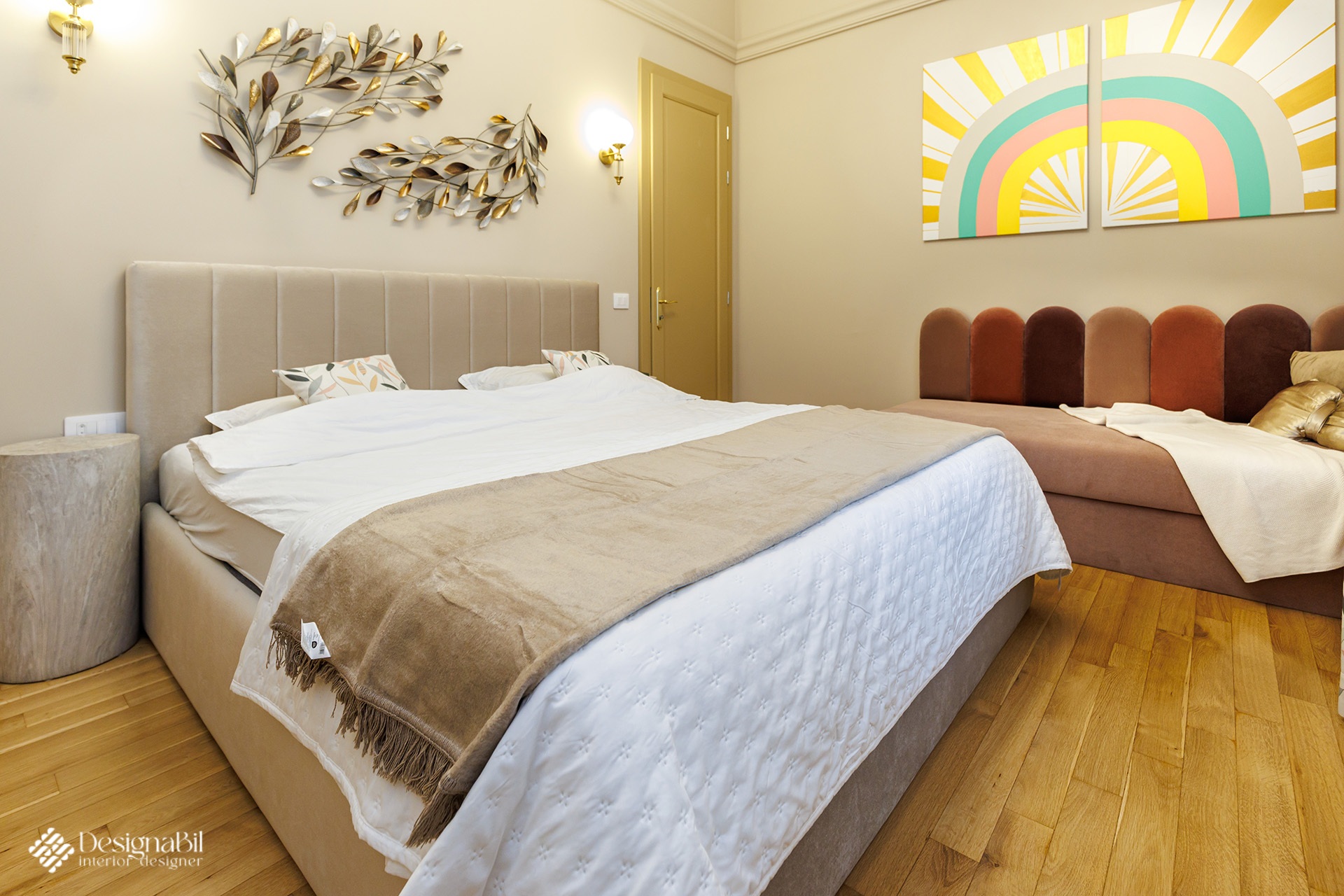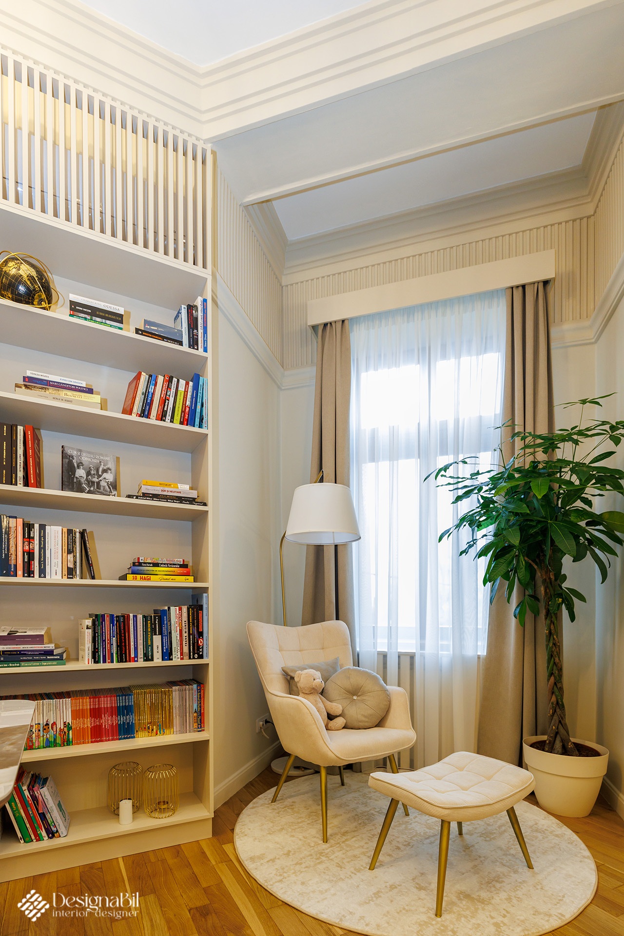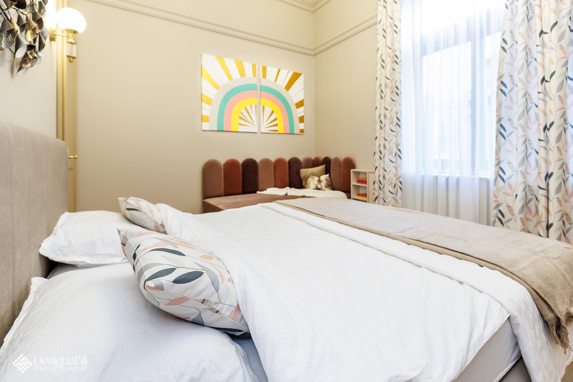 Obiectele alese în proiectul de design impuneau automat o anumită ”greutate” vizuală care să se integreze perfect în decorul elegant și cromatica discretă. Singurul loc îndrăzneț a fost al mezinei familiei care a dorit tare mult curcubeul ei favorit deasupra patului roz, desigur. Ne-am asigurat ca nuanțele curcubeului sa fie regăsite în tonalități mult mai deschise, în draperia discretă. Mobilierul creat a fost gândit astfel încât să se integreze cu ambientul și să cuprindă spațiul de depozitare dorit.