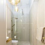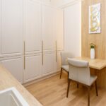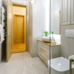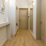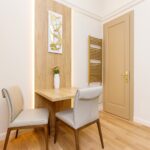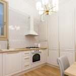Având în vedere dorința proprietarilor de a păstra pardoseala din lemn masiv, se impuneau niște uși de interior pe măsură, drept urmare, am ales niște uși de lemn masiv înalte de 2,4m pentru a fi proporționale cu înălțimea considerabilă a apartamentului. Singura încăpere unde nu am putut păstra vechea pardoseala a fost actuala bucătărie unde am avut grijă să alegem un parchet în nuanță cât mai apropiată de cea de la lemnul masiv din celelalte încăperi.
